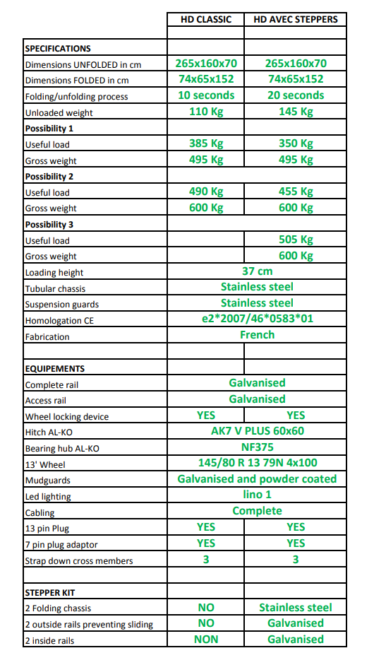 The new stainless steel folding motorbike trailer HD version is the only one in the world which folds and unfolds in seconds with no effort and that can take a 500 Kg bike. It work in the exact same way as what the LT version does and the châssis has simply be redesigned in order to cater heavier bikes